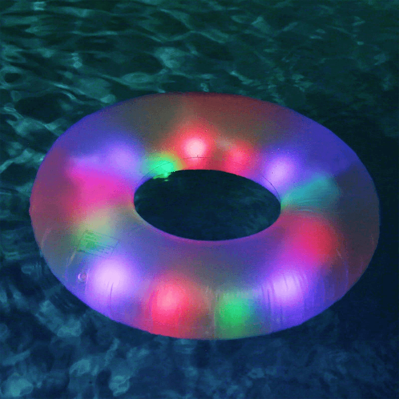Bring a light show to your next pool party! Powered by PoolCandy LiveLights, the Illuminated LED Jumbo Pool Tube is a colorful way to light up your night! Lay on it or play on it - the 48" LED Pool Tube is fun for everyone! Completely waterproof, the lights can be set to glow a solid color blue, purple, red or green, or set up as party mode - continuously changing lights through different colors. 3 AA batteries (required)