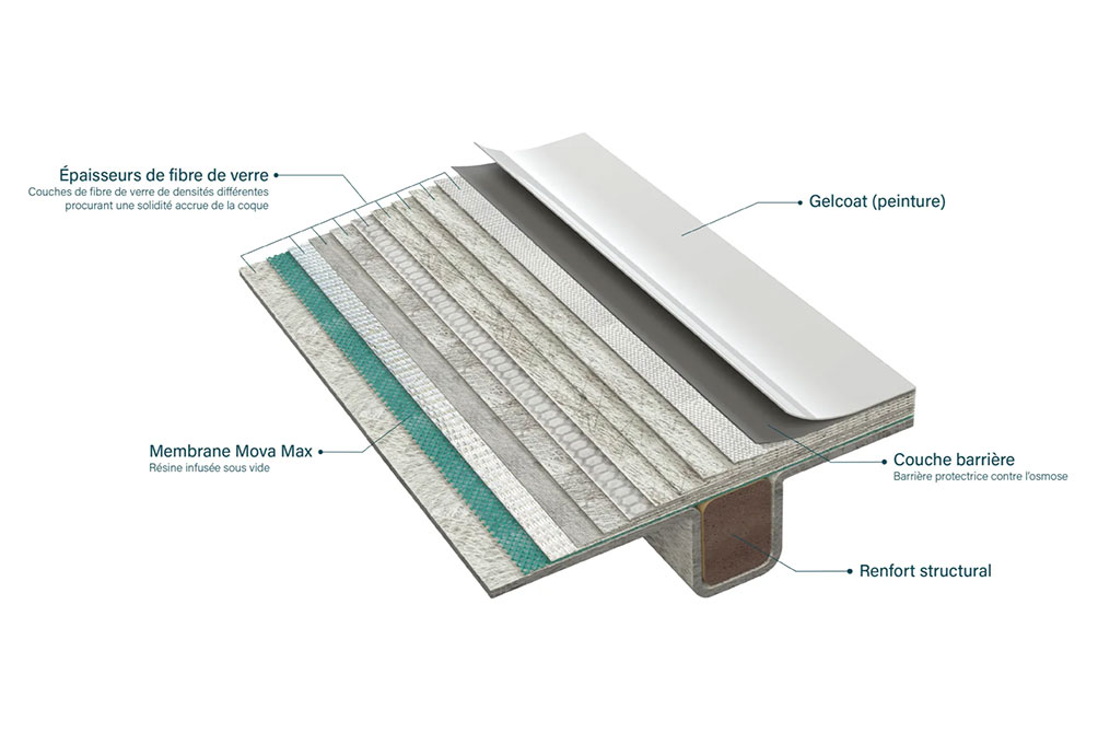 MovaMax technology draws on the most advanced fiberglass manufacturing methods, such as those used for wind turbine blades and sailboat hulls, to create sturdy and durable monocoque pools. This unique expertise gives them exceptional resistance to freezing, cracking, and stress during installation, while limiting the risk of osmosis. The most fragile areas of the shell are reinforced and high-performance insulation reduces heat loss, so your water stays at the ideal temperature for longer.