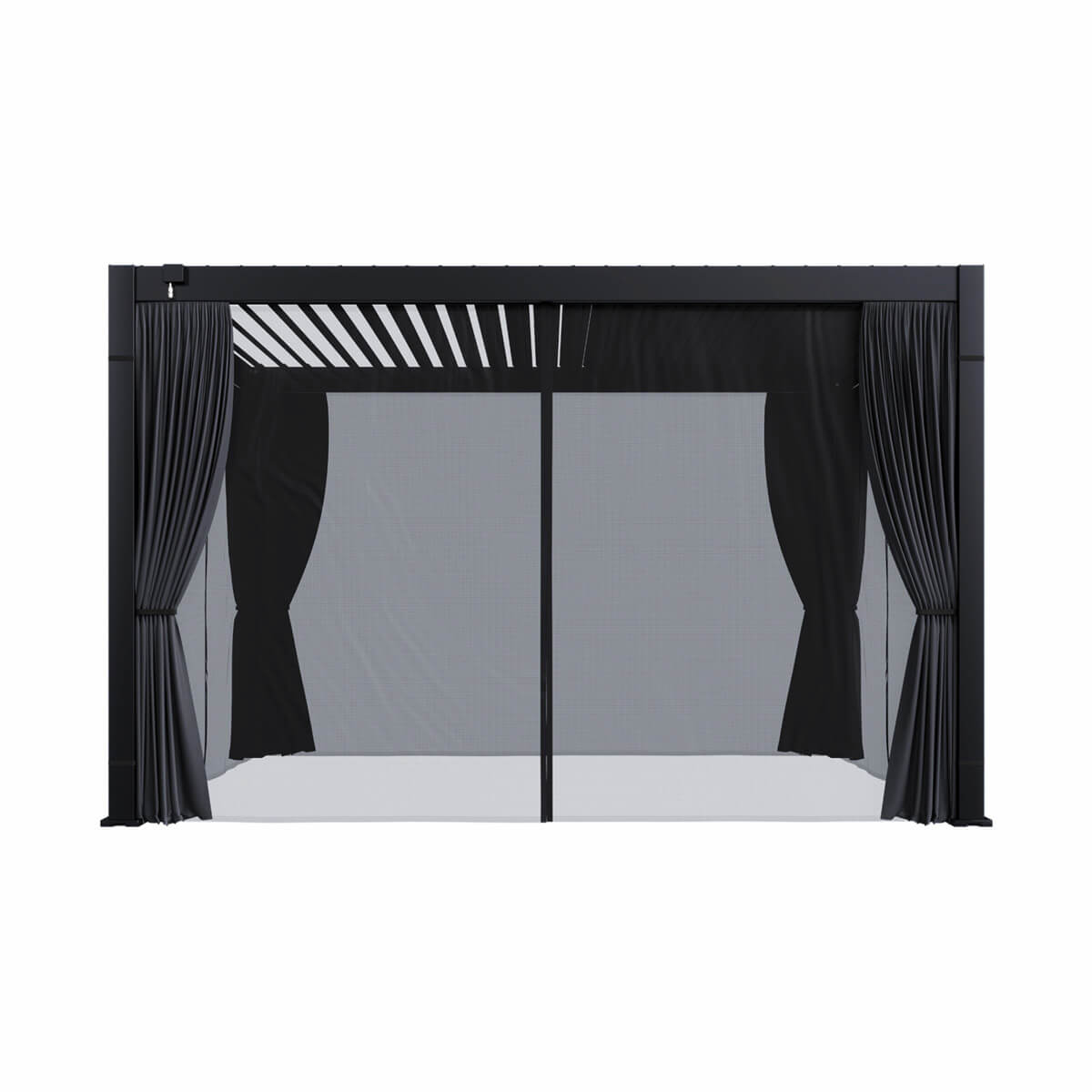 Create a true retreat around your pergola with this set of curtains and mosquito nets. Elegant and practical, it protects you from the sun and insects while adding style and comfort to your outdoor living.