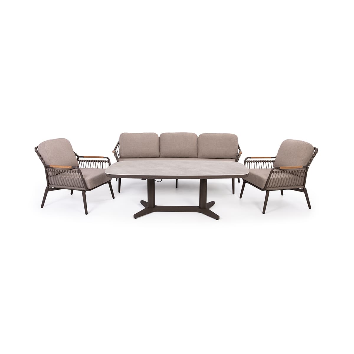 Transform your outdoor space into a true haven of style with the Capri set. Featuring 2 club-style dining chairs, a curved sofa, and a height-adjustable dining table in taupe brown aluminum, this set combines modern design with exceptional comfort. The elegant shapes of the sofa and chairs invite relaxation, while the versatile table adapts to every occasion, from casual meals to intimate evening gatherings. Weather-resistant and built to last, this set is the perfect finishing touch for a stylish and welcoming outdoor space.
