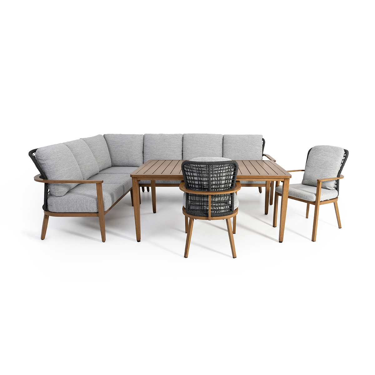 Paired with matching chairs that combine wood-effect aluminum, woven rope, and water-resistant cushions, this set blends style and functionality. The spacious 59'' x 39'' dark brown aluminum table perfectly complements the ensemble, creating an ideal setting for enjoyable outdoor meals.
