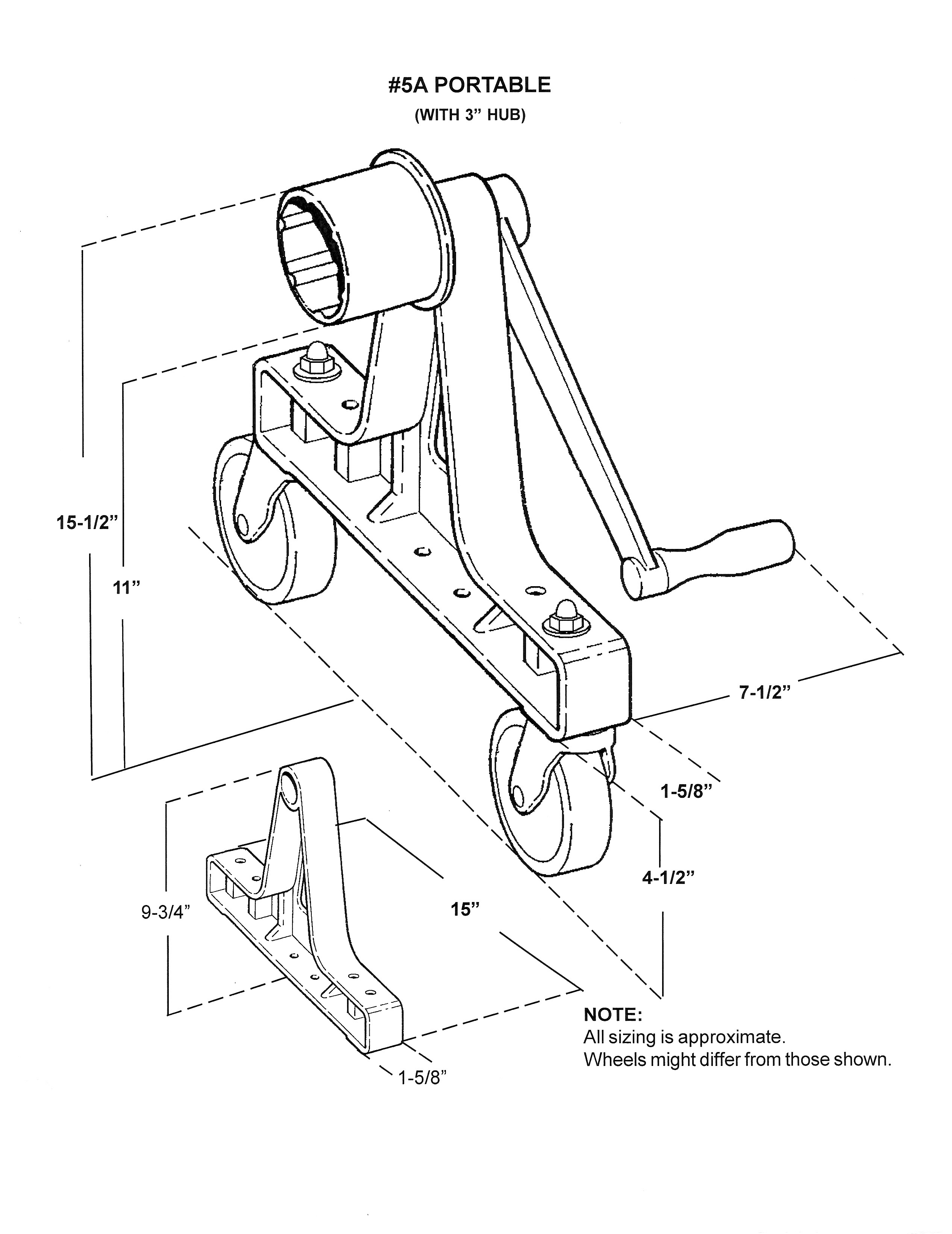 Comes with 4" castors and a large handle to cope with the larger pool covers. Ground clearance to tubing underside is approximately 13". Each 5A base kit box weighs 15 lbs.