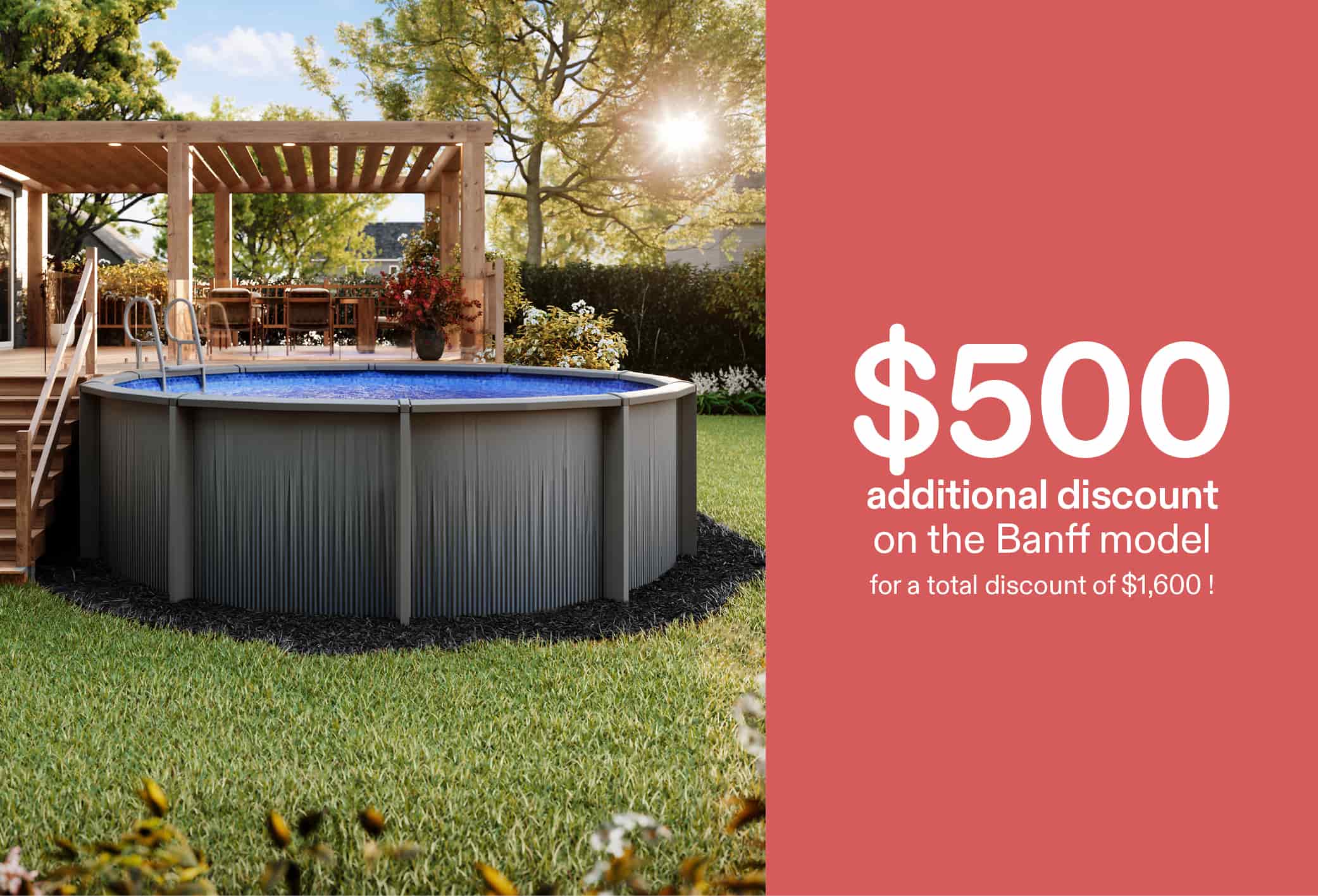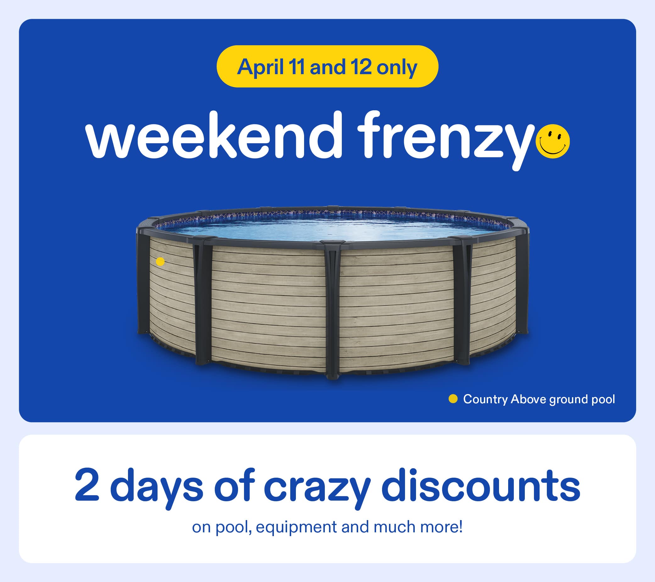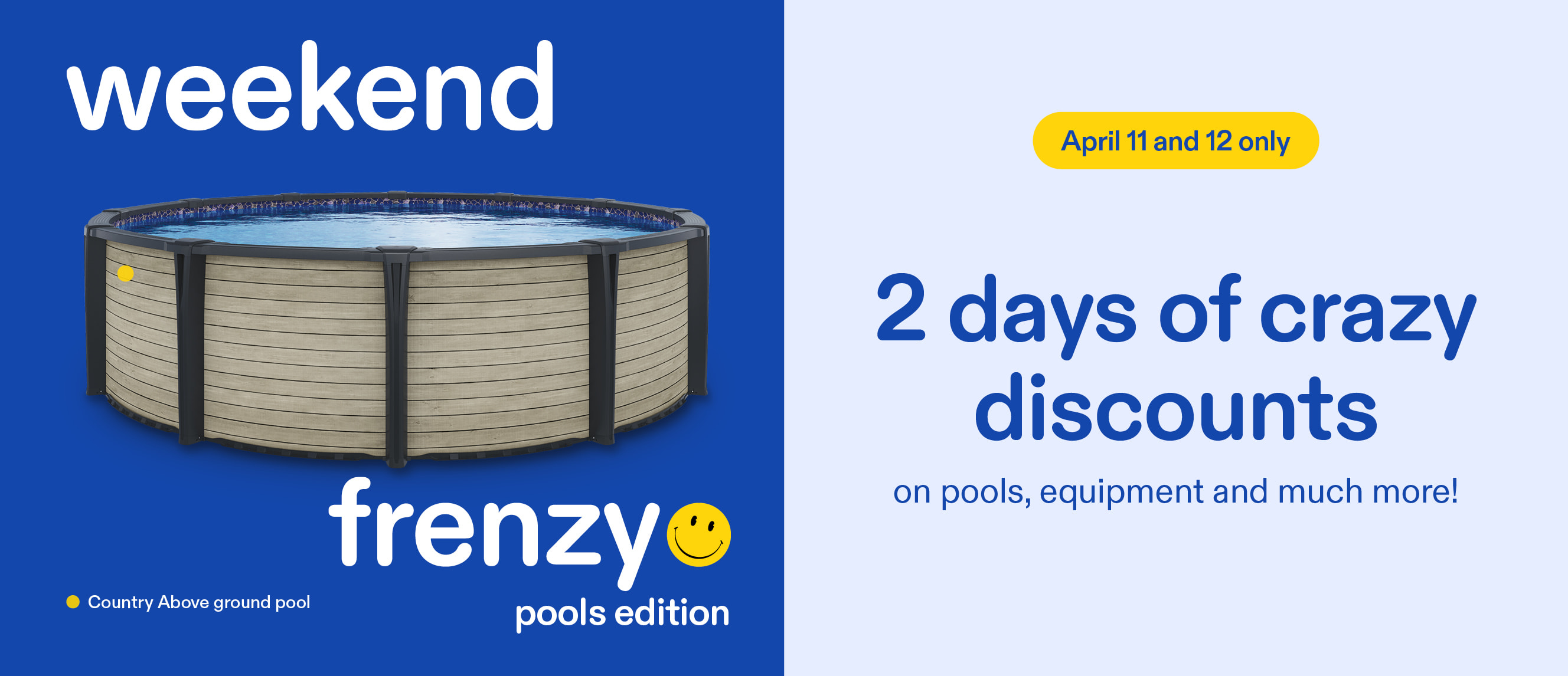 *The Weekend Frenzy offers are valid April 11 and 12, 2026, in-store only. Taxes extra. Financing terms and interest rates are subject to change at any time by financial institutions. See in-store for details. The “Save $1,100 on above ground pools” offer includes a $1,100 discount on the purchase of an above-ground pool, plus a free AquaNature 50,000 L salt system valued at $800 (SKU 182411), offered with the purchase of an equipped pool eligible for the promotion. The free salt system applies only to models compatible with a salt system and excludes Soho, Maho, and Orizon steel models. A Starfall illuminated waterfall (valued at $655) is offered for free with the purchase of a Carvin resin pool, including the Carvin pump and filter only. Waterfall installation not included. While supplies last. See in-store for details. The “Save 15% on replacement liners for above ground and inground pools” offer applies to selected models. The discount does not apply to installation. The “Up to $300 on heat pumps” offer applies to selected models only. — These offers cannot be combined with any other promotion and apply to regular-priced items only. Not valid on previous purchases. Products and promotions may vary by store. Not valid in clearance centers. Images for illustrative purposes only. Quantities may be limited. The retailer reserves the right to modify or cancel any offer without notice. Despite care in producing this publication, errors may occur. In case of discrepancy, in-store information prevails.