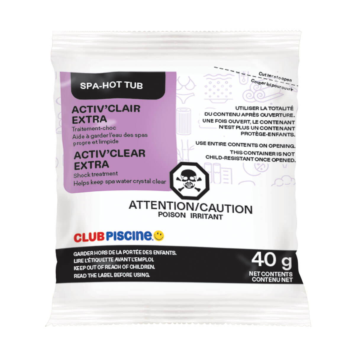 Activ'Clair augmente l'oxydation des contaminants afin d'éviter les chloramines et améliore ainsi la désinfection de l'eau des spas. Ce produit offert en doses uniques permet également de réduire la consommation de chlore de 50% à 75% pendant toute l'année. L'utilisation hebdomadaire d'Activ'Clair rend l'eau des spas des plus limpides!