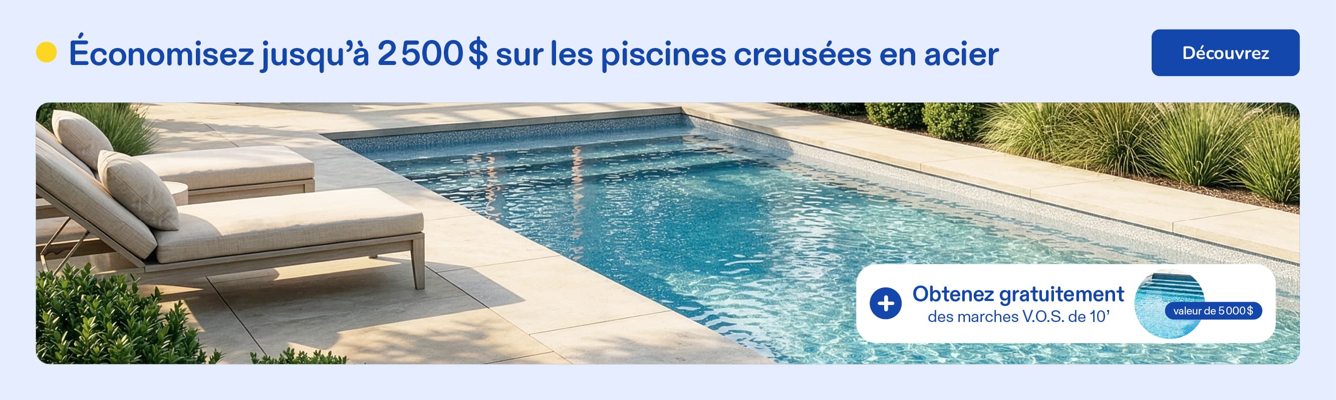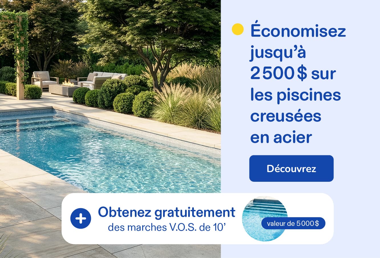 *Les offres Week-end en folie sont valides les 11 et 12 avril 2026, en magasin seulement. Taxes en sus. Les conditions de financement et les taux d’intérêt peuvent être modifiés en tout temps par les institutions financières. Détails en magasin. L’offre « Économisez 1 100 $ sur les piscines hors terre » prévoit un rabais de 1 100 $ à l’achat d’une piscine hors terre, ainsi qu’un système au sel AquaNature 50 000 L gratuit, d’une valeur de 800 $ (PTR 182411), offert à l’achat d’une piscine équipée admissible à la promotion. La gratuité du système au sel s’applique uniquement aux modèles compatibles avec un système au sel et exclut les modèles en acier Soho, Maho et Orizon. Une chute illuminée Starfall (valeur de 655 $) est offerte gratuitement à l’achat d’une piscine en résine de marque Carvin incluant la pompe et le filtreur de marque Carvin. Installation de la chute en sus. Jusqu’à épuisement des stocks. Détails en magasin. L’offre « Économisez 15 % sur les toiles de remplacement pour piscines hors terre et creusées » s’applique aux modèles sélectionnés. Le rabais ne s’applique pas sur l’installation. § L’offre « Jusqu’à 300$ sur les thermopompes » s’applique aux modèles sélectionnés seulement. — Ces offres ne peuvent être jumelées à aucune autre promotion et s’appliquent au prix régulier seulement. Non applicables aux achats antérieurs. Les produits et les promotions peuvent varier d’un magasin à l’autre. Offres non valides dans les centres de liquidation. Photos à titre d’illustration seulement.Les quantités peuvent être limitées. Le marchand se réserve le droit de modifier ou d’annuler toute offre sans préavis. Malgré le soin apporté cette publication, des erreurs peuvent s’y être glissées. En cas de divergence, les informations en magasin prévalent.